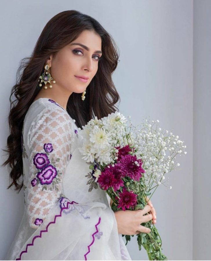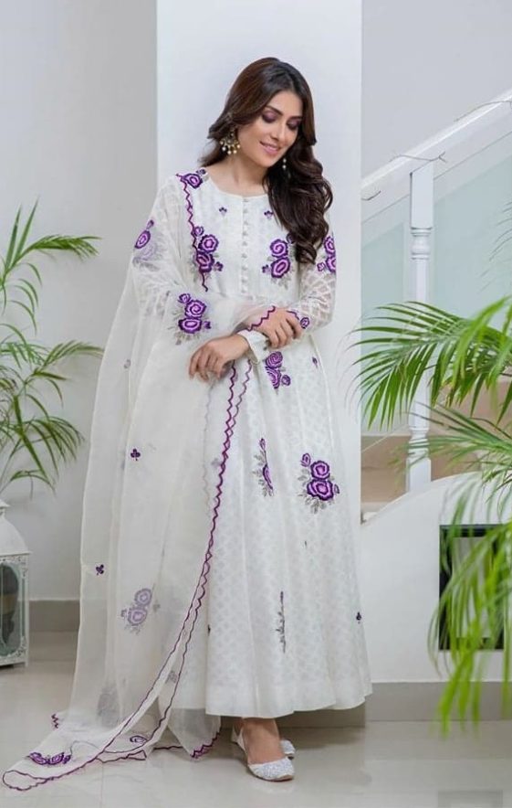 Ayeza Khan opted for an exceptionally simple and elegant Eid dress. Her white dress with purple cutwork and motifs was the work of Ansar Jahangir. Although her dress was very somber, her makeup was brave to improve her overall oath look.