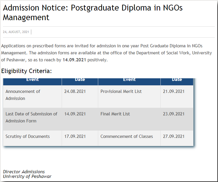 The University of Peshawar UOP invites application from the interested and eligible candidates for admission 2021 in Postgraduate Diploma in NGOs Management. The candidates who want to apply for admission are informed that the last date to apply for admission is 14th September 2021. The documents scrutiny will be on 17th November 2021. The provisional merit list will be issued on 21st September 2021, Final Merit List will be issued on 23rd November 2021 and the classes will start from 27th September 2021.